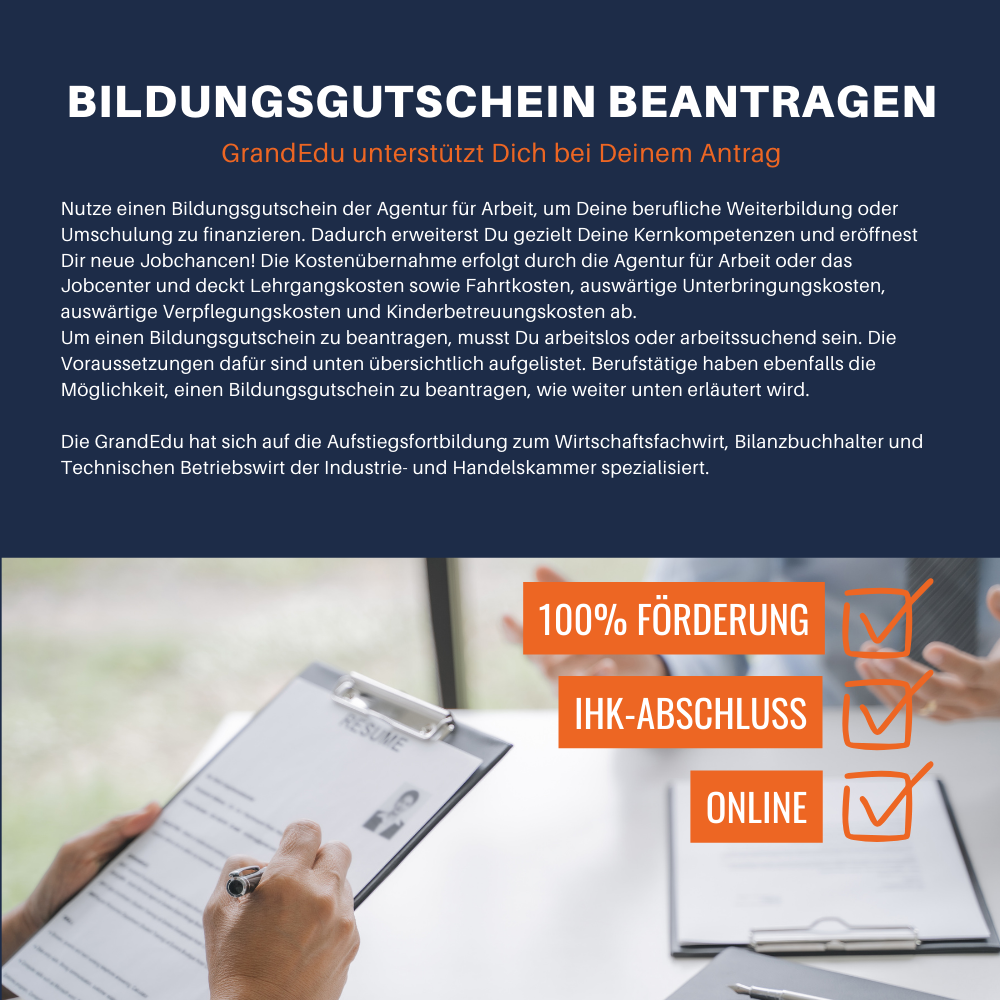 - Suche im Internet nach Bildungsanbietern, die zertifizierte Weiterbildungen anbieten. Es ist wichtig sicherzustellen, dass der gewählte Anbieter über eine Träger- und Maßnahmenzulassung gemäß den geltenden Rechtsvorschriften des SGB III verfügt, da nur solche Bildungsträger durch den Bildungsgutschein gefördert werden. Mit GrandEdu als Anbieterin bist Du auf der sicheren Seite, da wir entsprechend zertifiziert sind.