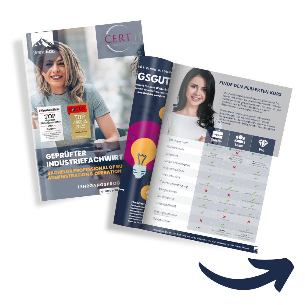 Tauche ein in die faszinierende Welt des Industriefachwirt - Bachelor Professional of Management for Industry und entdecke unser umfassendes Lehrgangsprogramm bei GrandEdu. Erlebe die Vielfalt unserer flexiblen Kursmodelle und vertiefe Dein Fachwissen auf spannende Weise. Von Vollzeitkursen bis hin zu rein videobasierten Lehrinhalten bieten wir drei verschiedene Varianten an, um Deine Bedürfnisse und Zeitpläne optimal zu erfüllen. Darüber hinaus zeigen wir Dir gerne, wie Du Zugang zu dem begehrten Bildungsgutschein Deiner Agentur für Arbeit erhältst, der Dir eine 100%ige Förderung ermöglicht. So kannst Du ohne finanzielle Sorgen Deinen Weg zum Wirtschaftsfachwirt antreten. Erfahre alles über unsere Kursangebote und starte noch heute Deine Reise zu neuen beruflichen Höhen!